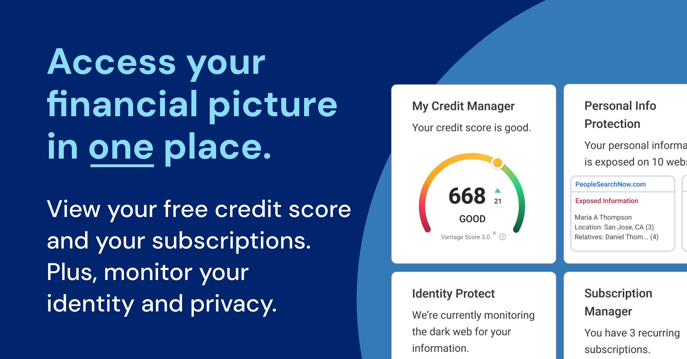 Dark web monitoring:2 We scan the web for fraudulent use of your personal information including name, address, email and more