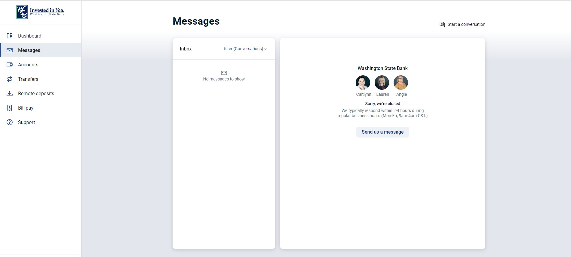 - Chat with a Personal Banker about transactions you might see in your accounts or any other banking questions you may have. Click 'Messages' on the menu bar or the blue icon on the dashboard. Once a conversation has begun, you will be notified of an approximate response time and receive another notification when the Personal Banker has sent a response. From here you can attach a transaction, account, payment, or file.